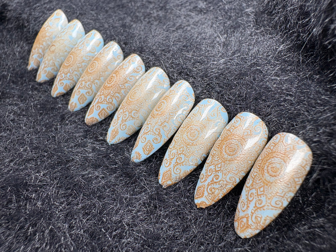 Add a touch of artistry to your manicure with these Blue & Gold Mandala Press-On...