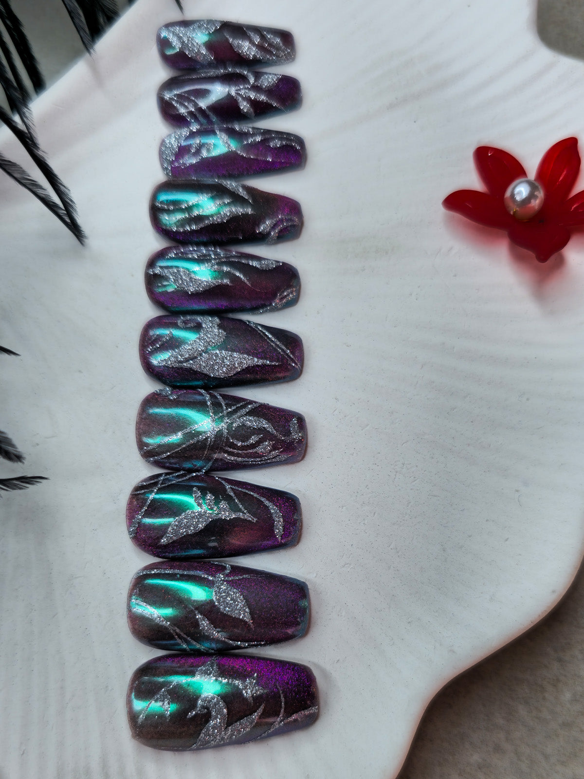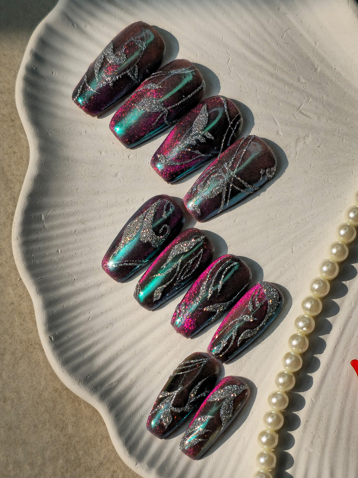 Step into a realm of mesmerizing beauty with our Enchanted Chroma Vines press-on nails. This extraordinary handcrafted set features a deeply captivating chameleon base that shifts through iridescent shades of deep plum, vibrant fuchsia, and electric teal with every movement. Over this magical canvas, a delicate, hand-painted vine motif swirls elegantly, highlighted by sparkling silver glitter accents.