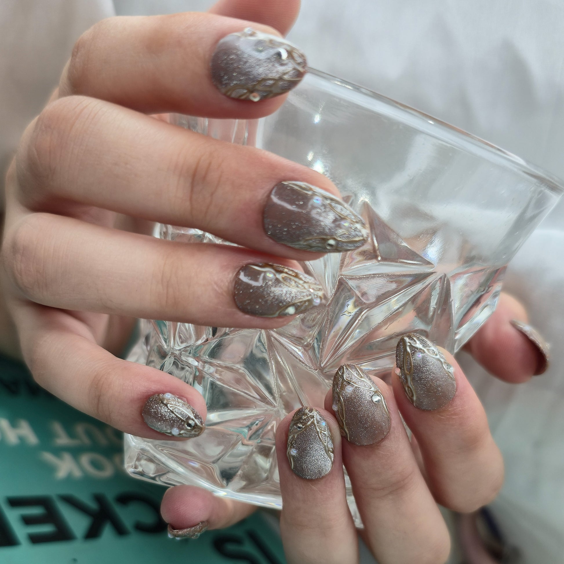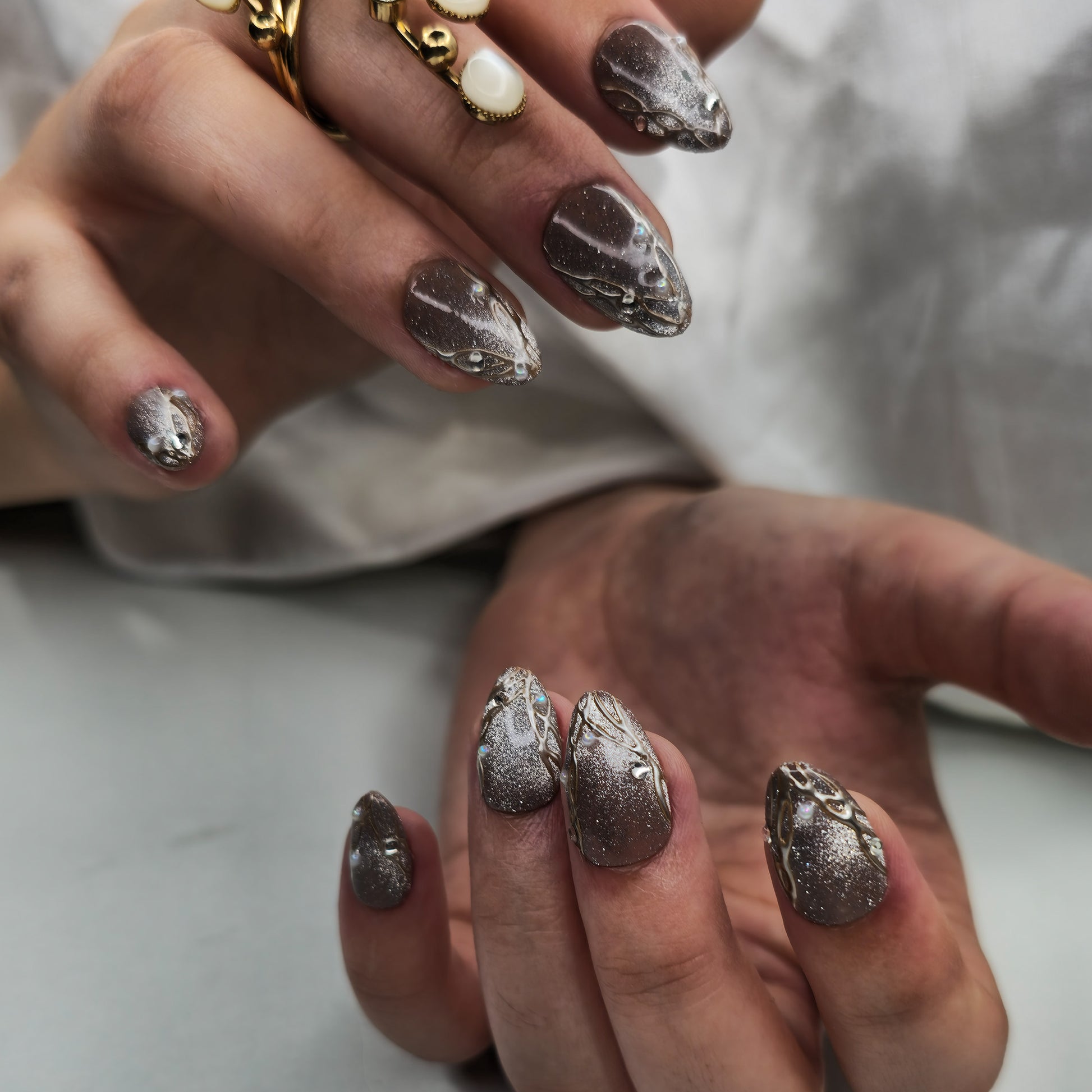 - Luxurious Design: Stunning brown nails with gold foil accents and glitter.