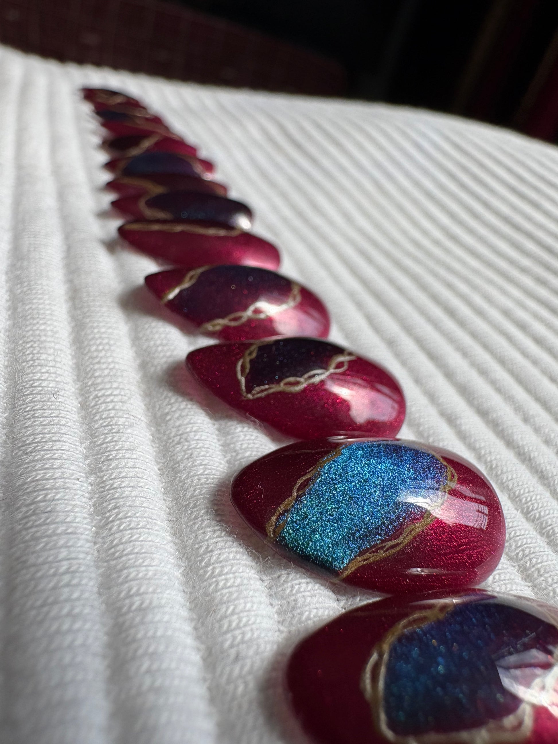 Elevate your nail game with Velvet Teal Elegance — a luxurious set of press-on nails featuring a rich maroon base, glittery teal accents, and delicate gold detailing. Handcrafted by a professional nail artist, these reusable nails offer salon-quality style with effortless application. Perfect for weddings, parties, or everyday glam